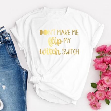 The standout feature of our Witch Switch T-Shirt is its fun and witty design. The phrase “Don’t Make Me Flip My Witch Switch” is prominently displayed in eye-catching typography, adding a touch of humour and personality to your outfit. The bold print is perfect for making a statement and sparking conversations at Halloween gatherings.